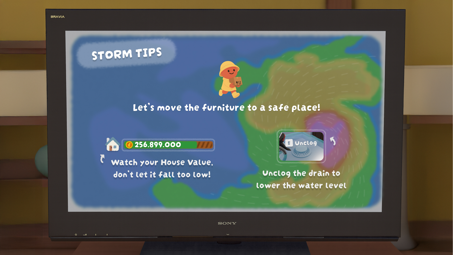 Work together (or by yourself) to save your properties from being swallowed by the water by moving them upstairs before the rising flood destroys them. Unclog your drains to help the water flow out. You only have a limited time and space, so choose what you want to save wisely!